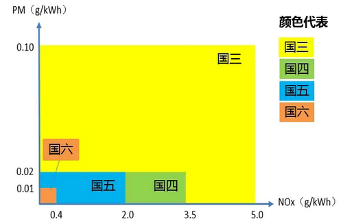 柴油機穩(wěn)態(tài)工況(ESC/WHSC)國三到國六排放最主要污染物NOx與PM限值對比圖: