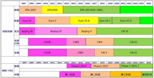 三、重型發(fā)動機全球排放標準發(fā)展歷程: