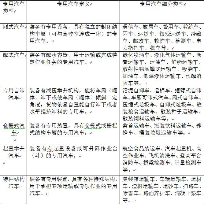 GB/T 17350-1998還將國產(chǎn)專用汽車劃分為廂式汽車、罐式汽車、專用自卸汽車、超重舉升汽車和特種結(jié)構(gòu)汽車等六大類