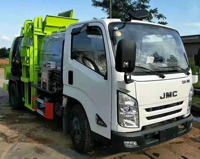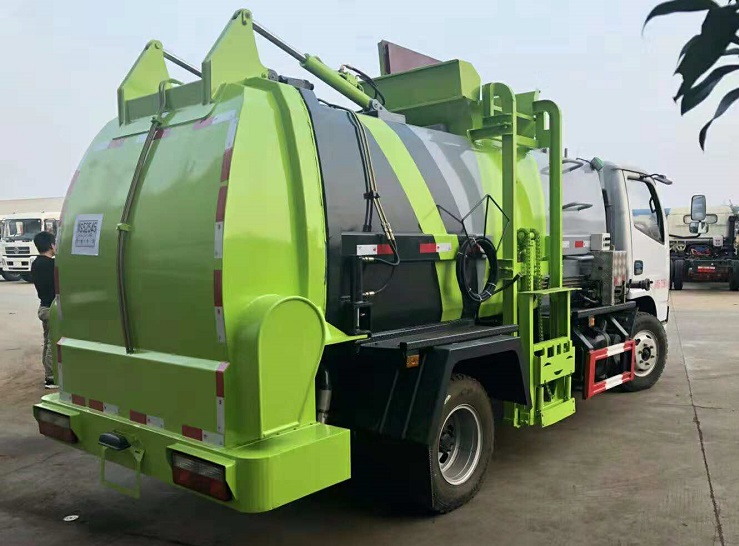 其工作原理是:將盛有餐廚垃圾、容積為120L(或240L)的標(biāo)準(zhǔn)垃圾桶掛好在側(cè)提桶機(jī)構(gòu)桶架上后,啟動提升機(jī)開關(guān),此時,頂蓋板打開、桶鎖緊并提升,當(dāng)桶提升到最高位置后,擺臂將桶翻轉(zhuǎn)將餐廚垃圾倒入垃圾箱中,然后空桶翻轉(zhuǎn)回位后下降直至機(jī)構(gòu)松開空桶并回到起始位置,關(guān)閉頂蓋板,該投料過程自動控制,能一次或多次地進(jìn)行。當(dāng)投料作業(yè)完成或作業(yè)過程中需壓縮垃圾箱內(nèi)餐廚垃圾時,采用手動方式操縱推板來壓縮垃圾并保持在壓實位置上,實現(xiàn)垃圾箱內(nèi)餐廚垃圾油水的初步分離和垃圾減容。此餐廚垃圾車采用推鏟推擠排料,其過程為自動控制。推擠排料過程為后門鎖銷打開,并通過順序閥打開后門,后門完全開啟后,啟動推板向后移動推料,沿水平方向?qū)⒗淅锏睦瞥?,然后推板退回到位、后門關(guān)閉到位后啟動鎖銷鎖緊。