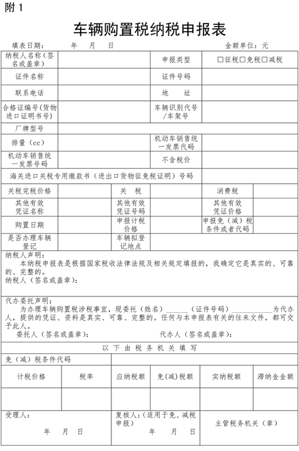 1.本表由車輛購(gòu)置稅納稅人在辦理納(免、減)稅申報(bào)時(shí)填寫(打印),由納稅人簽章確認(rèn)。