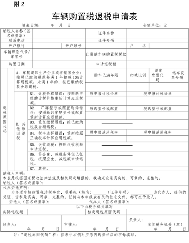 1.本表由車輛購(gòu)置稅納稅人在辦理退稅申請(qǐng)時(shí)填寫(打印),由納稅人簽章確認(rèn)。