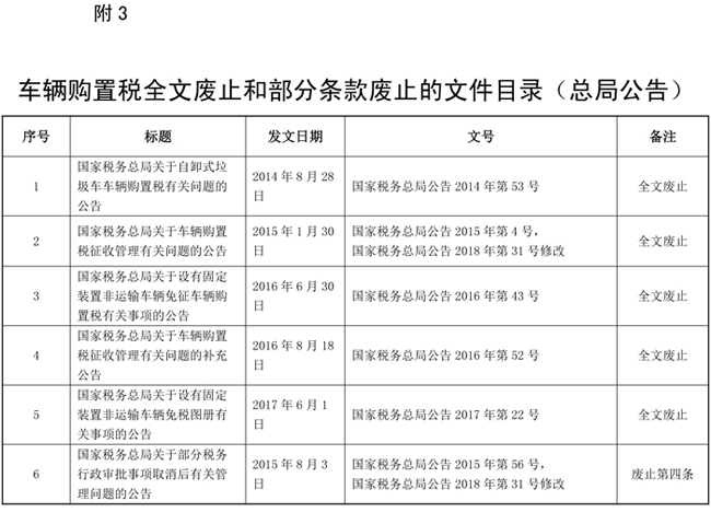 十九、本公告自2019年7月1日起施行。《車輛購(gòu)置稅全文廢止和部分條款廢止的文件目錄》(見附件三)所列文件條款同時(shí)廢止。