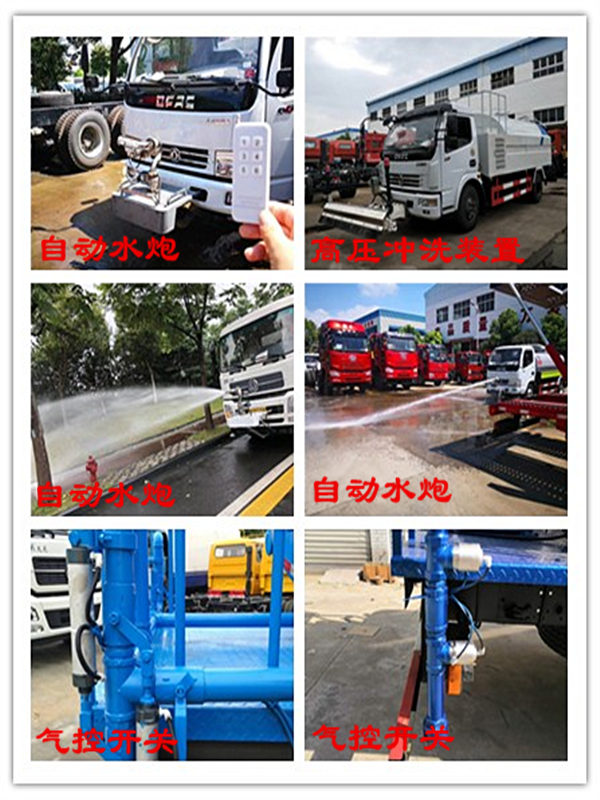 灑水車可加裝配置:噴霧機,弧形噴嘴,箭頭燈,自動控制,自動水炮,高壓沖洗裝置等。