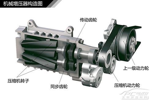 相對于渦輪增壓,機(jī)械增壓(Supercharger)的原理則有所不同。機(jī)械增壓主要是通過曲軸的動力帶動一個機(jī)械式的空氣壓縮機(jī)旋轉(zhuǎn)來壓縮空氣的。與渦輪增壓不同的是,機(jī)械增壓工作過程中會對發(fā)動機(jī)輸出的動力造成一定程度的損耗。