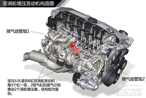 針對廢氣渦輪增壓的渦輪遲滯現(xiàn)象,排氣管上并聯(lián)兩只同樣的渦輪(每三個缸一組連接一個渦輪增壓器),在發(fā)動機(jī)低轉(zhuǎn)速的時候,較少的排氣即可驅(qū)動渦輪高速旋轉(zhuǎn)以產(chǎn)生足夠的進(jìn)氣壓力,減小渦輪遲滯效應(yīng)。