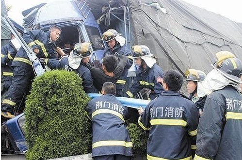 8點左右,荊門市消防支隊月亮湖中隊抵達事故現(xiàn)場。根據最早趕到現(xiàn)場的省高警荊門大隊民警提供的消息,除了先期救出的人員外,還有4人困在駕駛室內。