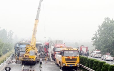 昨日清晨6時許,漢十高速云夢東入口處三輛大貨車大霧中連環(huán)相撞,造成司乘人員一死一傷。
