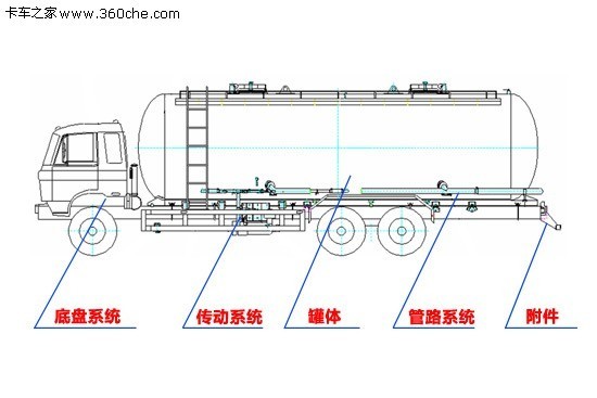 粉粒物料運(yùn)輸車主要由底盤與上裝部分組成,簡(jiǎn)單可以分為:底盤系統(tǒng)、傳動(dòng)系統(tǒng)、罐體、管路系統(tǒng)、附件等五大部分組成。