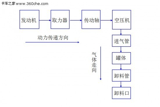汽車發(fā)動(dòng)機(jī)(或外置電機(jī))的動(dòng)力經(jīng)取力器、傳動(dòng)軸等傳動(dòng)裝置傳遞給空氣壓縮機(jī),由空壓機(jī)產(chǎn)生的壓縮空氣(或外接的壓縮空氣)進(jìn)入罐體內(nèi),經(jīng)過流化裝置把粉粒物料流化,因罐內(nèi)外產(chǎn)生的壓力差,粉粒物料隨空氣一起沿卸料管路輸送到罐外的儲(chǔ)料容器中。