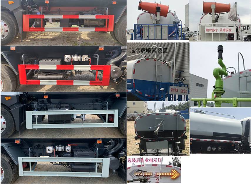 整車備注:1.該車主要用于城鄉(xiāng)園林綠化灑水;主要專用裝置為噴灑總成;罐體有效容積11.88立方米;2.隨底盤選裝同系列的高頂駕駛室,選裝不同外形管道,選裝風(fēng)機樣式,選裝高射炮樣式,選裝后噴霧,選裝左側(cè)噴灑,選裝右側(cè)噴灑,選裝后平臺樣式,選裝LED箭頭指示燈,選裝右側(cè)管道;3.整車長度/軸距/罐體外形尺寸(長×長軸×短軸)的對應(yīng)關(guān)系為(mm):8460/4500/(5150×2350×1450,4700×2400×1550),7910/3950/(4700×2400×1550);4.側(cè)防護,后防護材料為Q235;連接方式:焊接加螺栓連接,后部防護裝置斷面尺寸(寬×高)60×120(mm),后部防護離地高度:450mm;5.ABS系統(tǒng)控制器型號/廠家:J ABS/焦作博瑞克控制技術(shù)有限公司